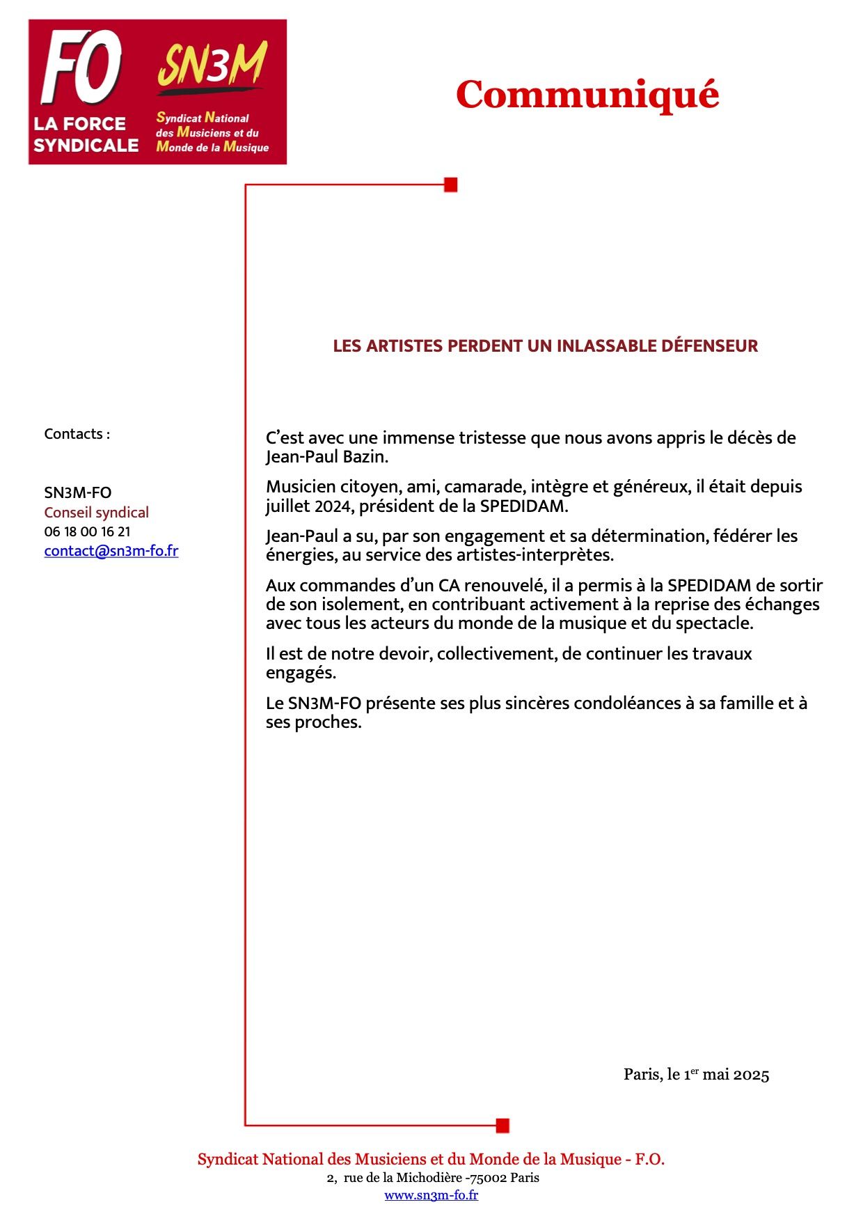Force ouvrière, la force syndicale / SN3M-FO, le Syndicat National des Musiciens et du Monde de la Musique Force Ouvrière